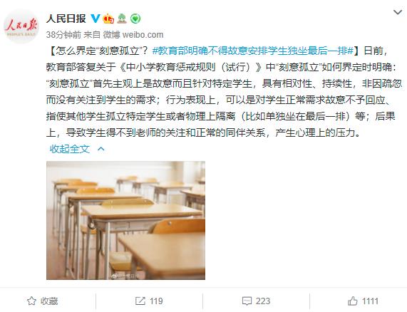 原标题:《教育部:不得故意安排学生单独坐最后一排!关于教育惩戒的这些事儿明确了》