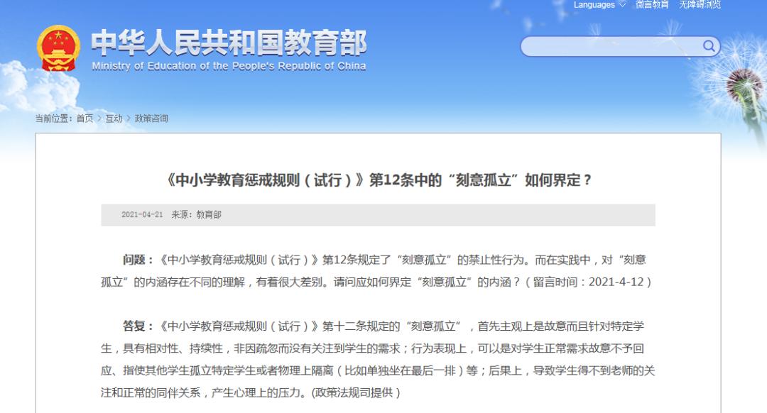 教育部在答复中明确:《中小学教育惩戒规则(试行)》第十二条规定的“刻意孤立”,首先主观上是故意而且针对特定学生,具有相对性、持续性,非因疏忽而没有关注到学生的需求;行为表现上,可以是对学生正常需求故意不予回应、指使其他学生孤立特定学生或者物理上隔离(比如单独坐在最后一排)等;后果上,导致学生得不到老师的关注和正常的同伴关系,产生心理上的压力。