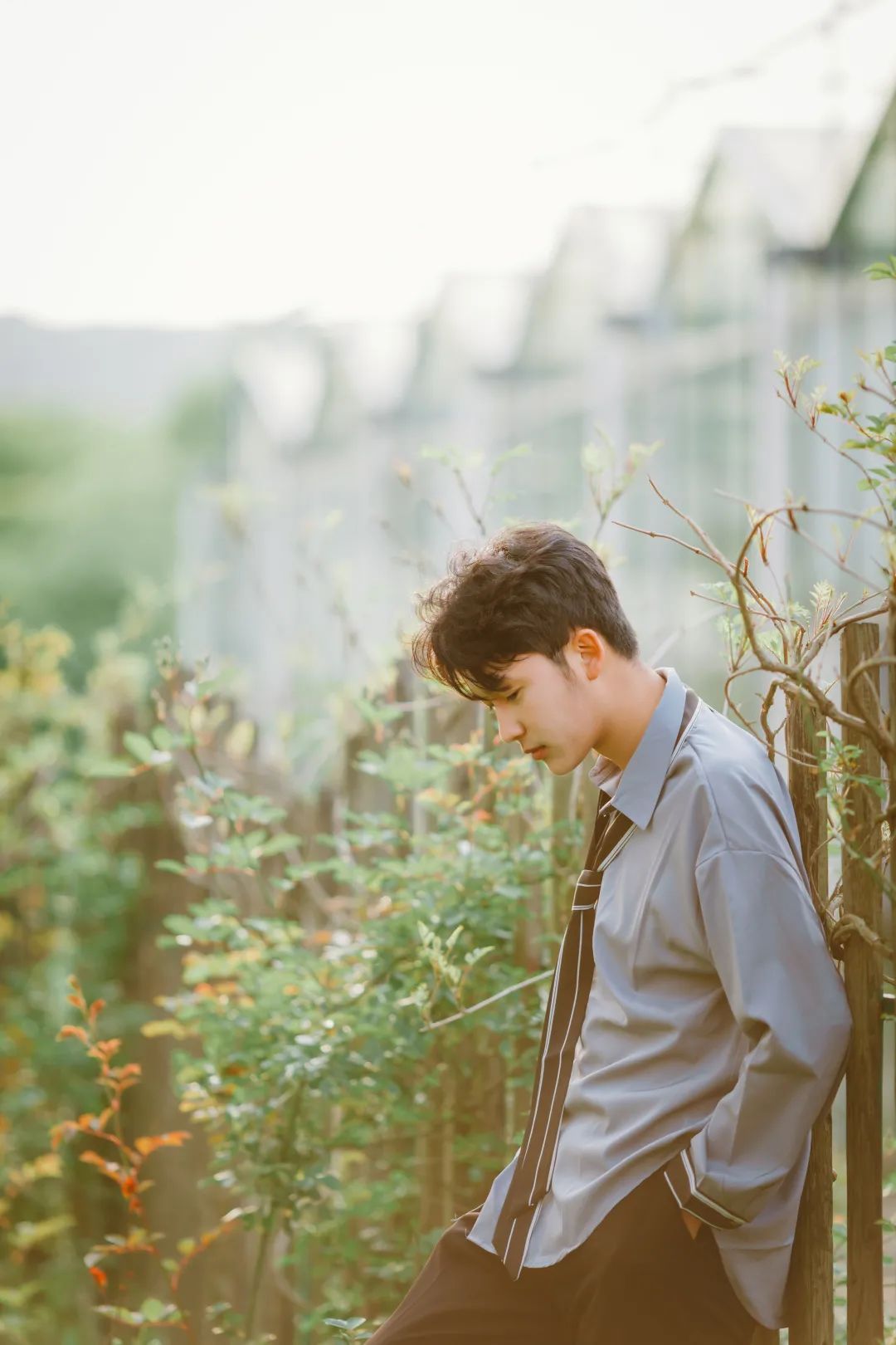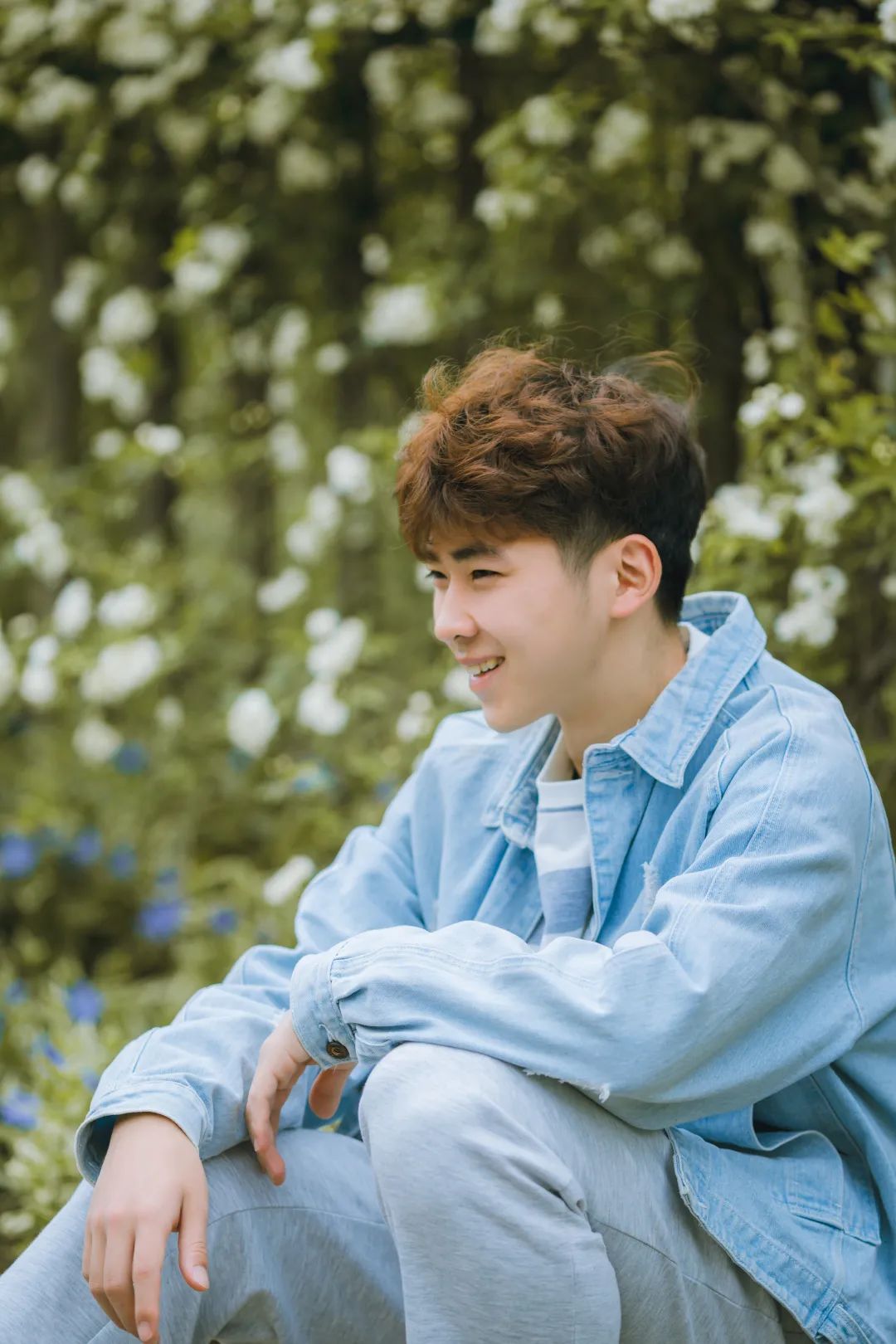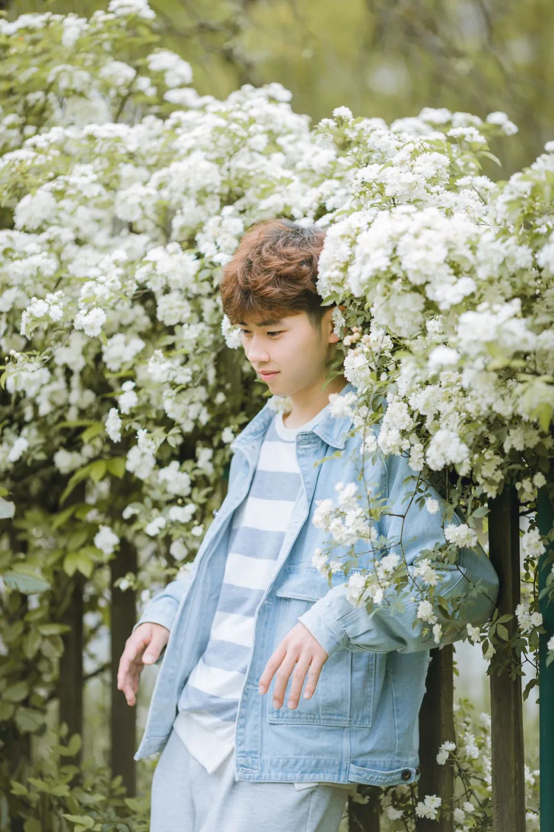 白色的花朵簇拥着,绿叶枝桠环绕,清新的牛仔衫搭配出春日的少年感。不必故作深沉,也不用假笑,表情自然一点吧,虽然不知道镜头会抓拍到哪一帧,但哪一帧都会是好看的。