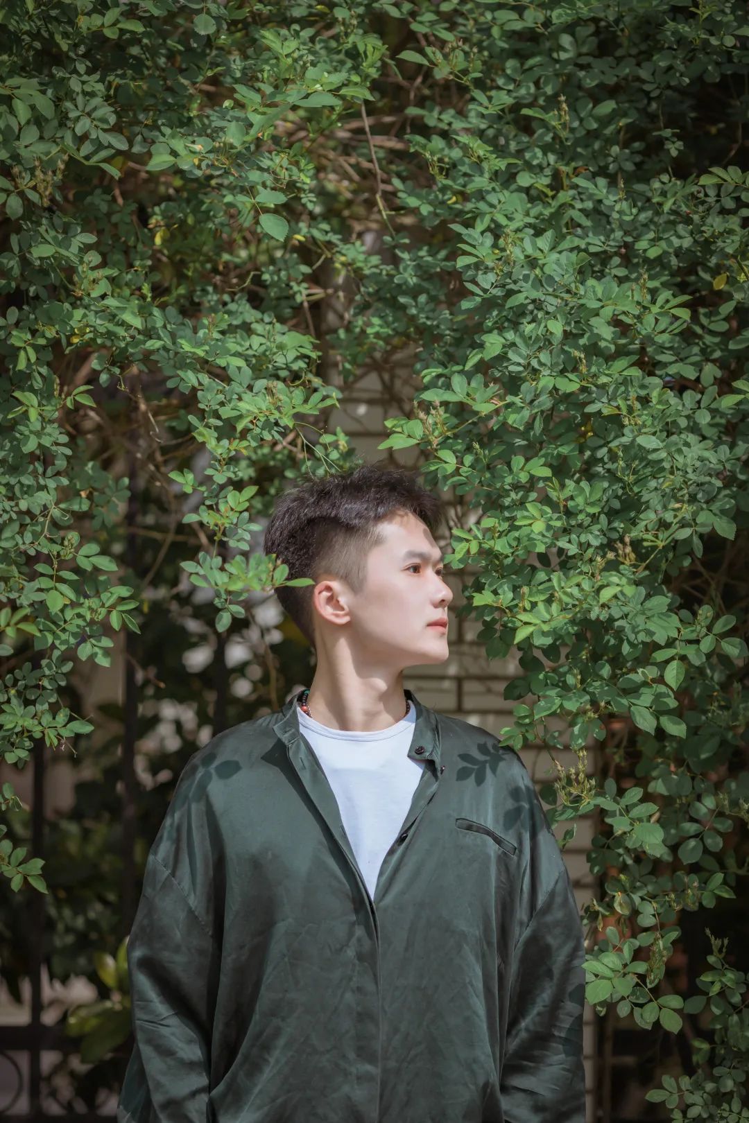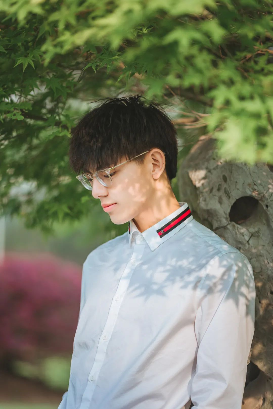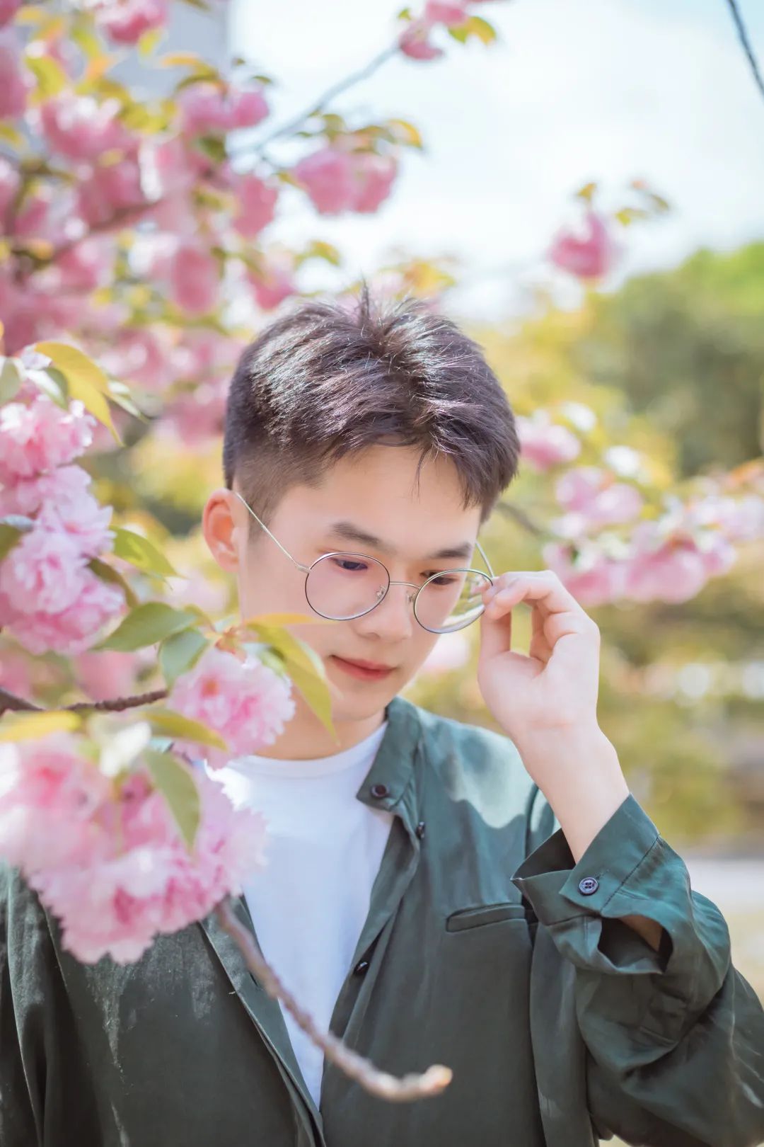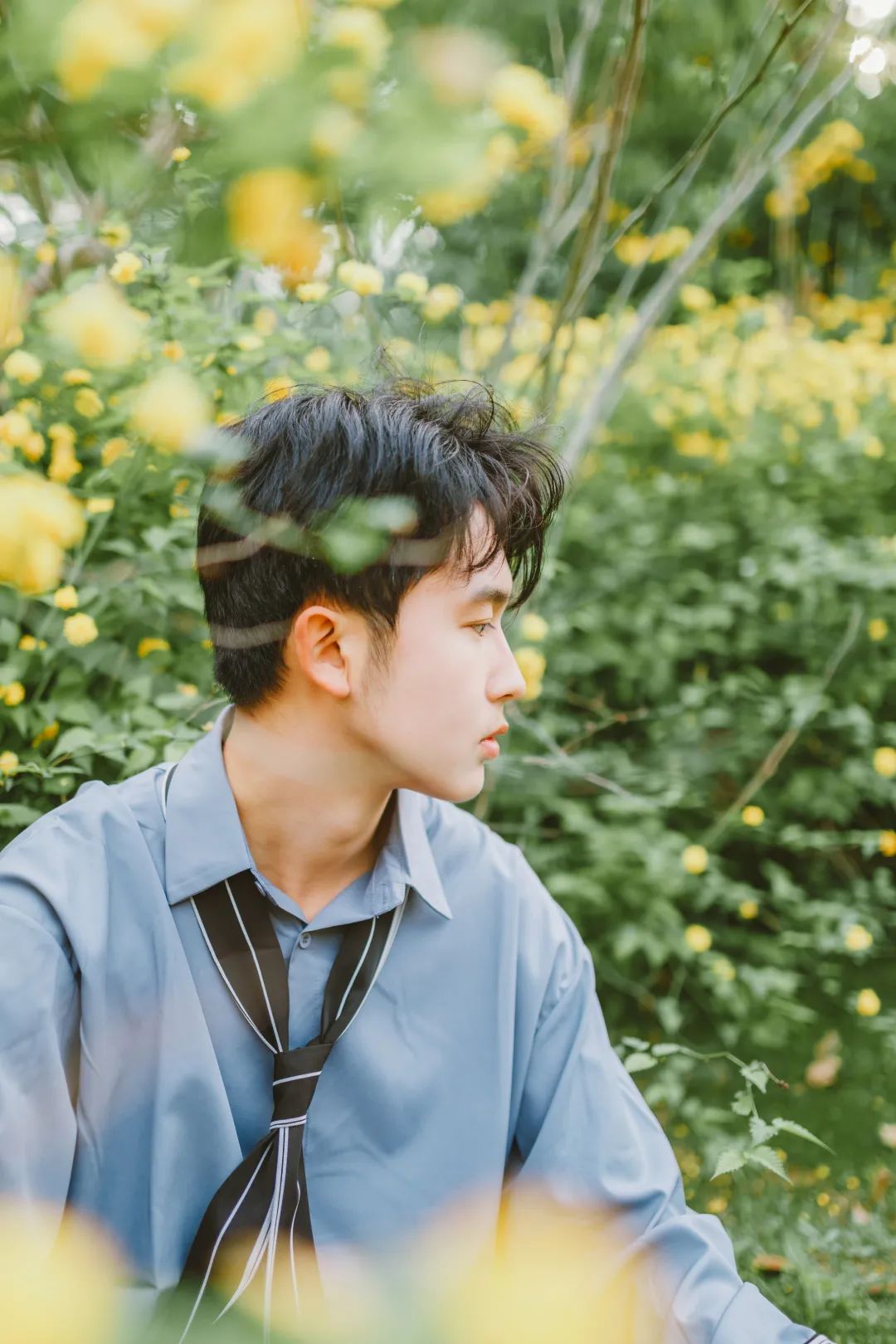 白色的花朵簇拥着,绿叶枝桠环绕,清新的牛仔衫搭配出春日的少年感。不必故作深沉,也不用假笑,表情自然一点吧,虽然不知道镜头会抓拍到哪一帧,但哪一帧都会是好看的。