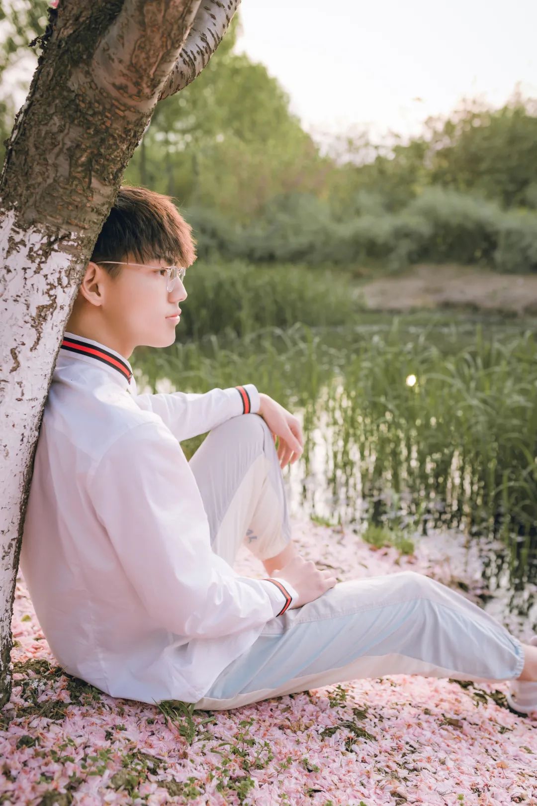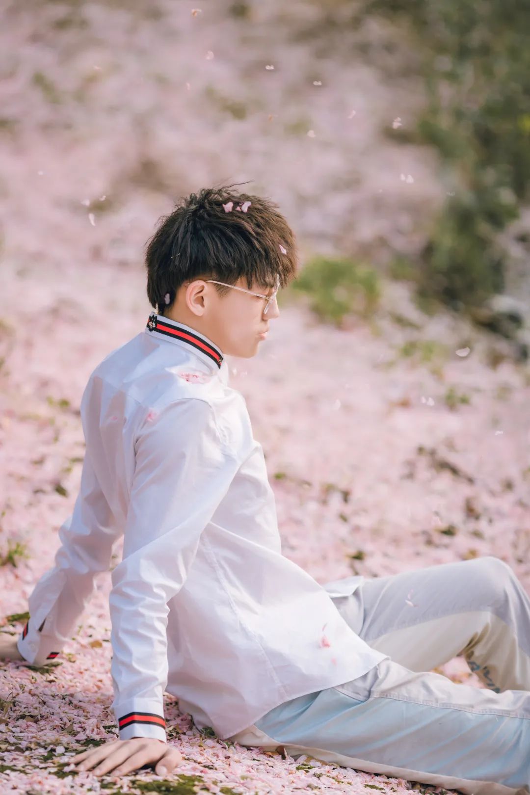 白衬衫让人少年感满满,倚着树干感受微风轻拂过脸庞,身下柔软的花瓣铺成粉色的樱海。望一望远处的景,画面定格,这一刻眼神里一定要充满对春日的深情。