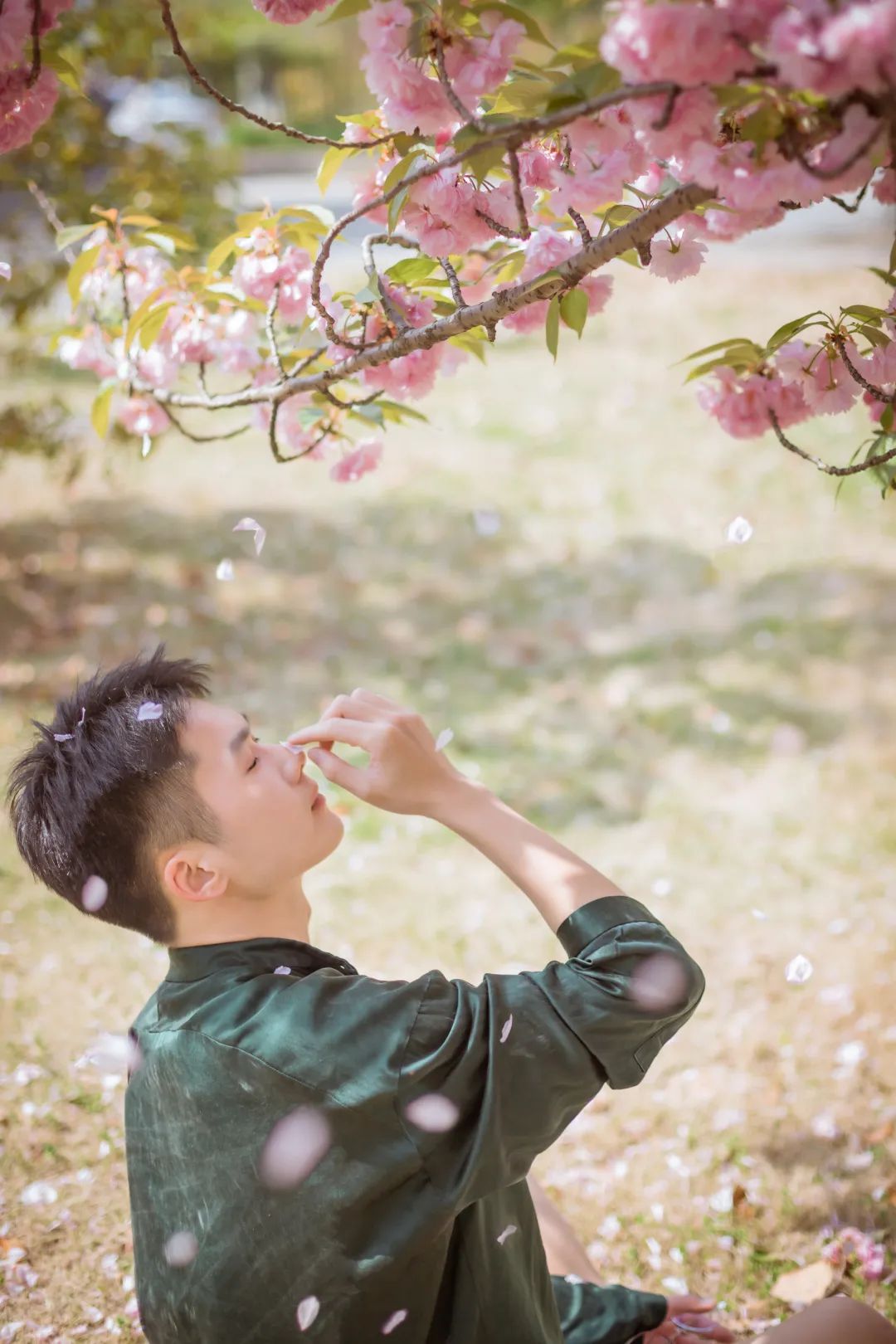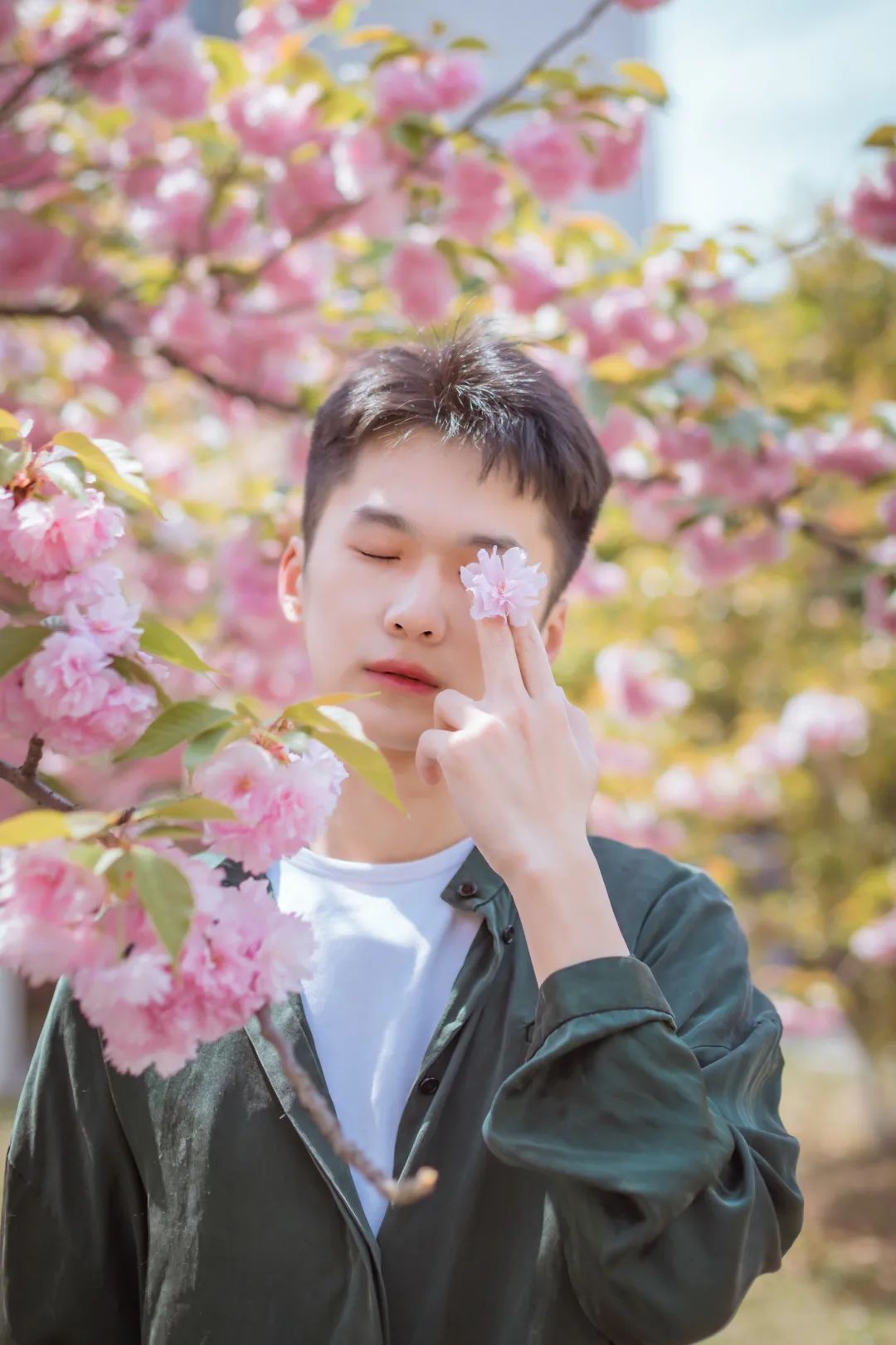 花放弃了做春天的C位,来衬托你少年意气。捻一朵花遮半边脸,低头轻嗅樱花清香,你可以选择不看镜头,闭上双眼,感受这人间四月芳菲落的氛围。