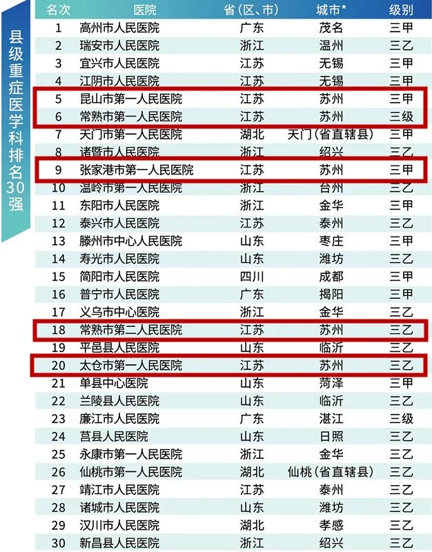 县级重症医学科排名30强