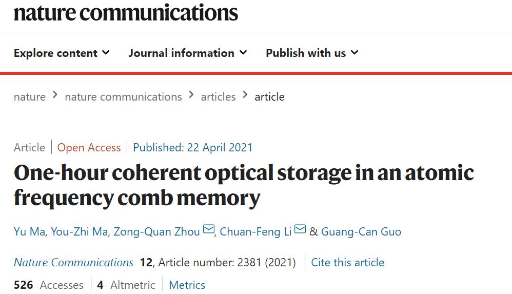 近日,中国科学技术大学的李传锋、周宗权研究组(郭光灿院士团队)在这一方面取得突破,将光存储时间提升至1小时,大幅刷新了8年前德国团队创造的1分钟的世界纪录,向实现量子U盘迈出重要一步。相关研究登上了《自然·通讯》期刊。