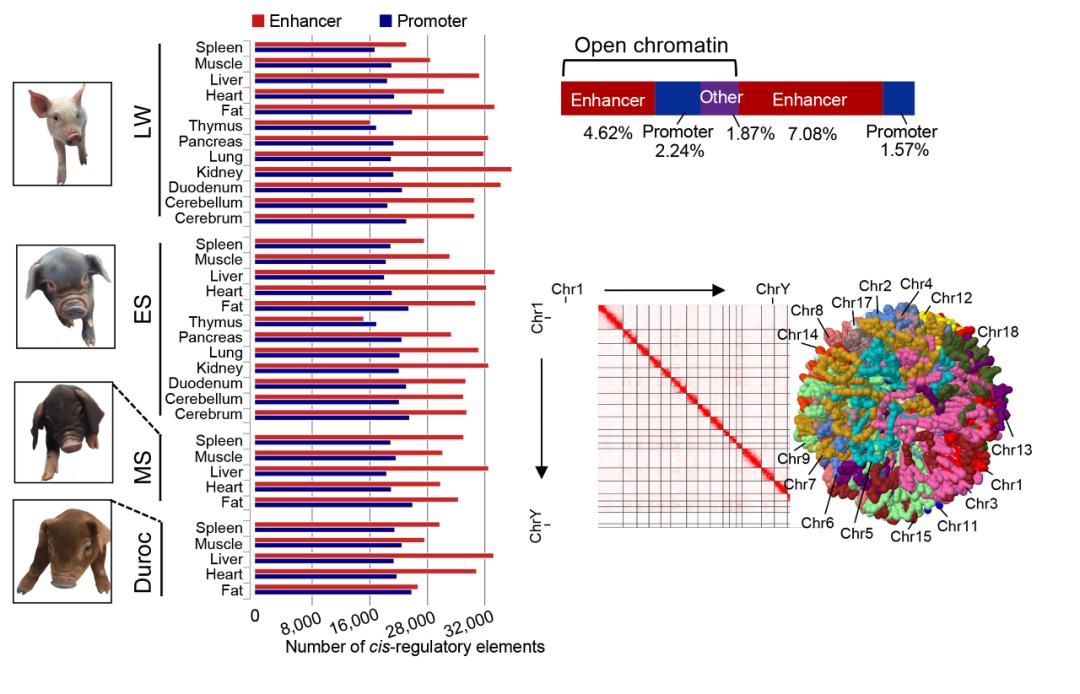 近日,华中农大赵书红教授与李新云教授团队绘制了目前涵盖品种信息和组织类型最广的猪基因组启动子、增强子、开放染色质区域及三维基因组精细图谱,大规模鉴定了顺式调控元件及调控区突变位点,揭示了影响猪表型变异的潜在调控机理,为应用功能SNP位点提升猪基因组育种效率奠定了基础,相关研究成果发表在国际期刊Nature Communications 上。
