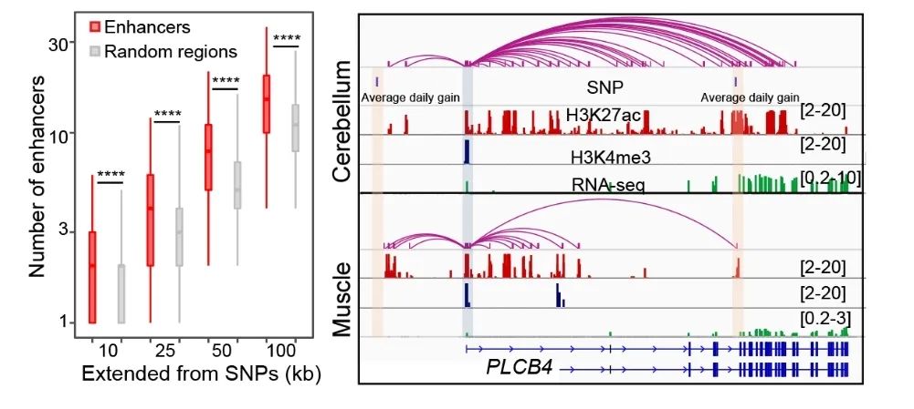 由于猪基因组调控元件与功能区突变挖掘滞后,导致猪基因组的功能位点与分子标记无法区分,基因组育种芯片设计时无法充分利用功能区域和功能位点信息,影响了基因组育种效率的提升。该研究通过整合调控元件、三维基因组及全基因组关联分析(GWAS)信息,解析了猪重要性状GWAS位点在调控元件周围的分布特征,对部分重要性状候选因果突变进行了鉴定,同时通过整合不同品种间基因组突变、表观修饰、三维基因组及基因表达变异,鉴定了一批具有潜在调控功能的重要SNP。以上成果为基因组育种技术创新及效率提升提供了丰富的数据信息,为加速猪经济性状遗传改良开辟了新路径。