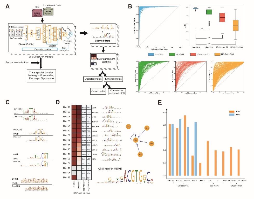 Results: DeepCNN not only achieves greater successes on Arabidopsis TFBS predictions when compared with gkm-SVM and MEME, but also has learned its known motif for most Arabidopsis TFs as well as cooperative TF motifs with PPI (protein-protein-interaction) evidences as its biological interpretability. Under the idea of transfer learning, trans-species prediction performances on ten TFs of other three plants of Oryza sativa, Zea mays and Glycine max demonstrate the feasibility of current strategy.