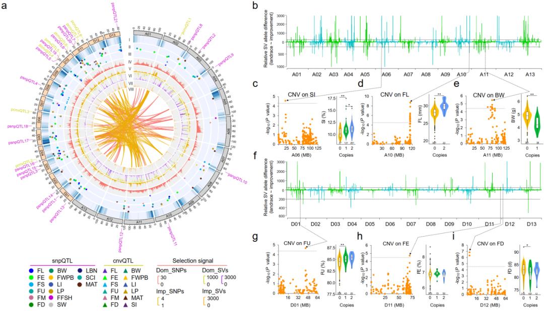 最后,研究人员利用泛基因组数据分析了多个与纤维品质等性状相关基因在驯化和改良中的频率变化。