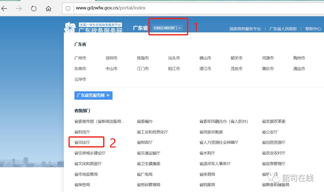 1.打开广东政务服务网页面,选择“切换区域和部门-省司法厅”。