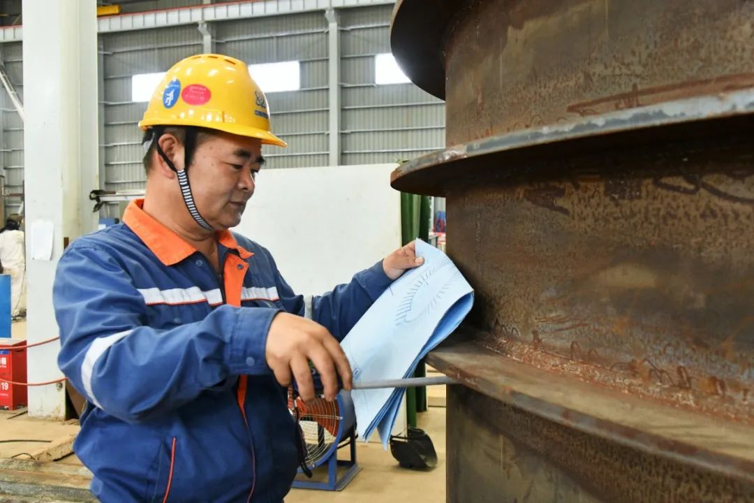在漳州3年来,从1号岛模块二到2号岛模块三,郭二景已经一块又一块地检验过166块筒体板。每一块筒体板的尺寸、弧度和角钢位置她都记得清清楚楚。但每次,面对任意一块筒体板,她还是不敢掉以轻心,必得全部仔细与图纸核对一遍,将一道道工序把关才能放心。