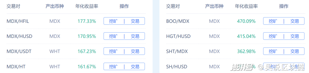 MDEX 作为火币集中生态资源扶持的 Heco 生态中的代表性项目,财富效应明显。下图可见,当前HECO链上流动性挖矿的头部选择仍旧能大致稳定在300%以上。
