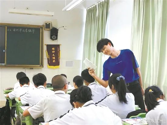 去年疫情期间,陈凯洲回母校广州一中拍了一条视频,高中时期的班主任一眼便认出了他。广州市第一中学初中部教导处副主任蔡文勇回忆接下来的情形:“我们校长通过教导处联系到陈老师,因为给学生上网课,我们需要教学风格生动的老师进行辅助教学工作。沟通之后,去年3月底,陈凯洲正式担任数学助教,辅导初三年级学生的数学课。”