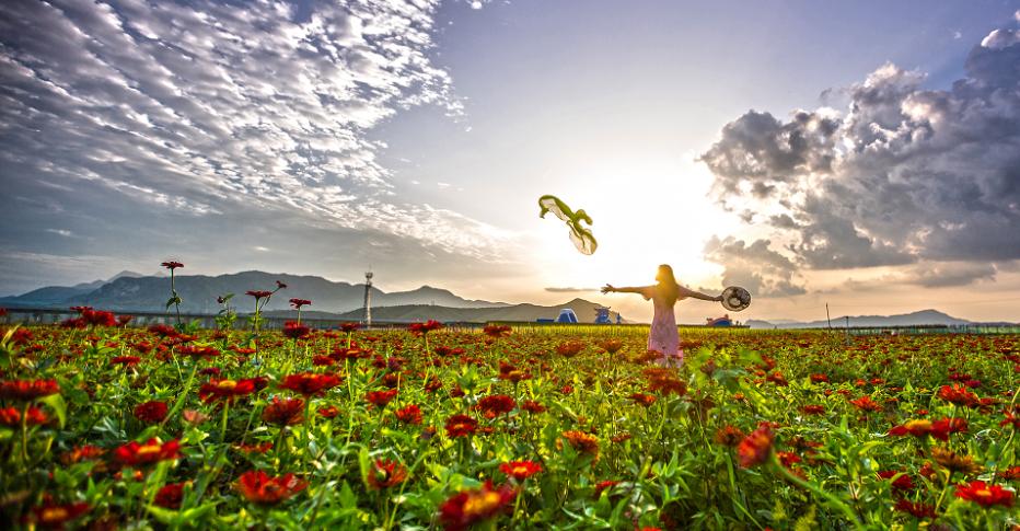 景区内大量种植观赏性花卉,片植果树;以爱情为主题的艺术广场由艺术花卉及景观小品、花海木屋等组成,美不胜收。