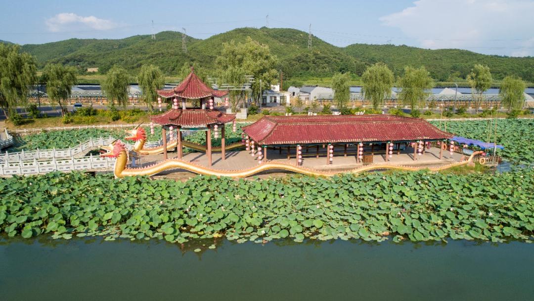 在这里,可以欣赏百米紫藤花长廊,漫步于长约70米的五彩风车廊道和油纸伞步道,还可以乘坐草河湿地竹排游船,观赏两岸风光。