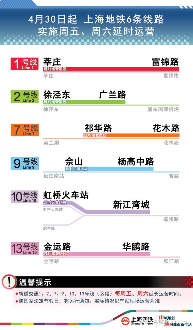 随着轨道交通网络客流规模基本恢复,市民乘客的夜间出行需求也逐步增加,在当前1、2、9、10号线提供周五、周六延时运营服务基础上,自2021年4月30日(周五)起,上海地铁恢复7、13号线周五、周六延时运营服务。至此,路网共1、2、7、9、10、13号线六条线路恢复实施周末延时运营服务。