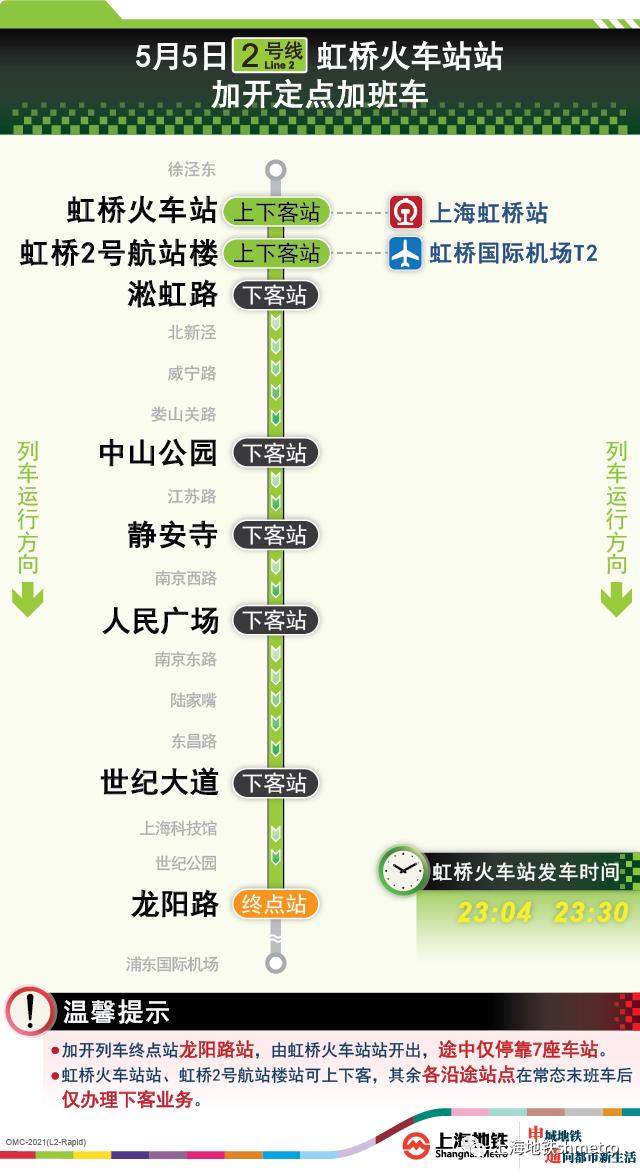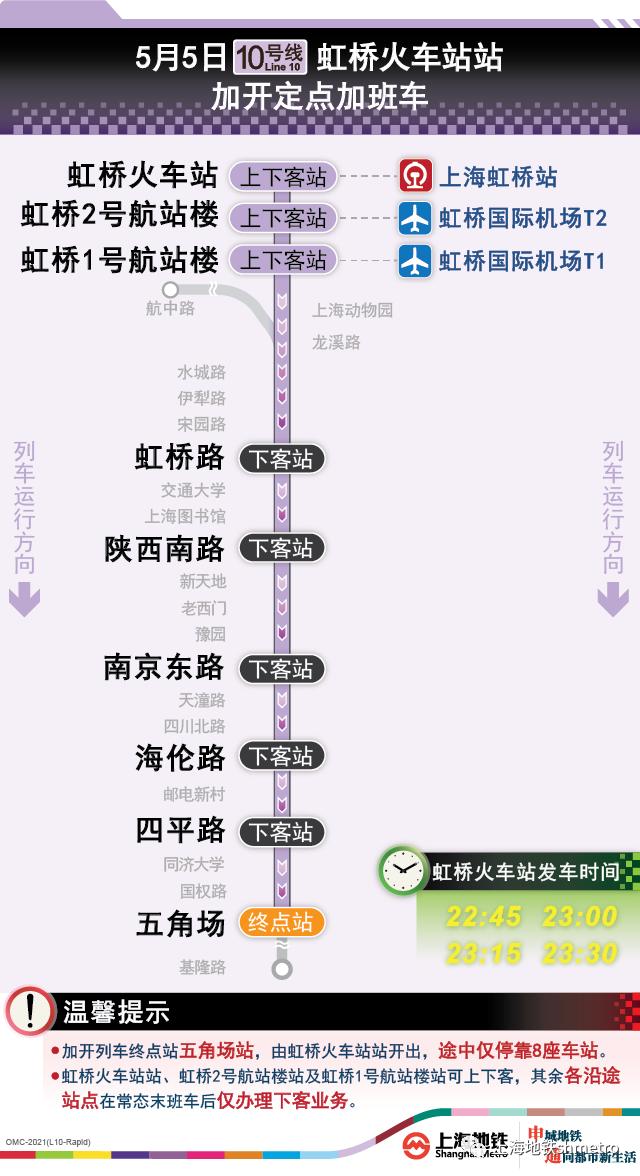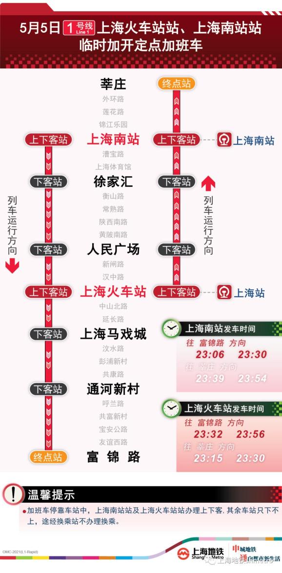 为提升五一返程期间重要交通枢纽夜间疏散能力,2021年5月5日(周三),在2号线虹桥火车站末班车后定点加开的基础上,1号线上海火车站站往莘庄方向、1号线上海南站站往富锦路方向,10号线虹桥火车站站往市区方向分别加开定点加班列车,最后一班定点加班车在三大火车站的发车时间延长至23:30,列车开行途中仅部分站点停靠,定点加开列车途经换乘站均不办理换乘。