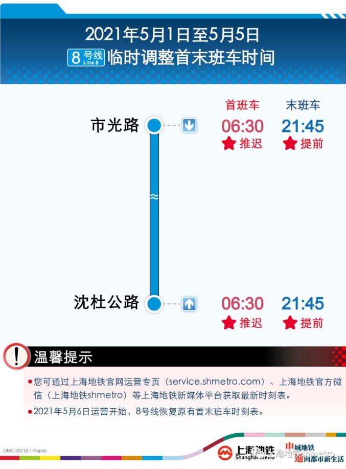 轨道交通8号线自07年年底通车来已运营13年,近期发现其关键运营设备接触网与列车受电弓磨损严重,亟需集中抢修整治。为确保运营安全、及时排除隐患,并尽可能将整治施工对市民乘客出行的影响降至最低,上海地铁计划于此次“五一”小长假客流低谷期,即5月1日至5月5日,对8号线市光路站至芦恒路站接触网和所有列车受电弓进行集中专项整治施工。期间,8号线将缩时运营,全天运营时间临时调整为:5月1日至5月5日,8号线延后60分钟开始运营(首班车始发时间由5:30延后至6:30),提前45分钟结束运营(末班车始发时间由22:30提前至21:45),提请乘客注意首末班车时刻,计划好出行时间。5月6日节后首个工作日起,8号线将恢复以往正常首末班车时间。