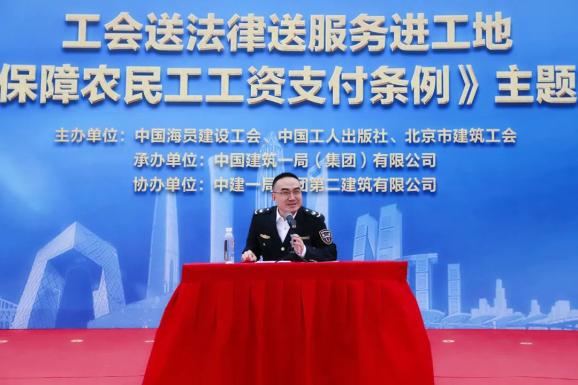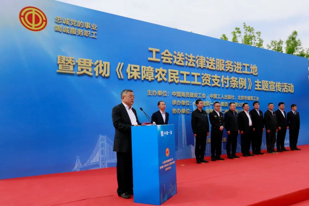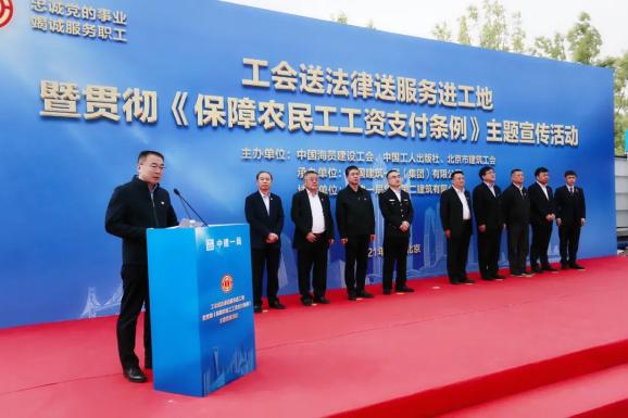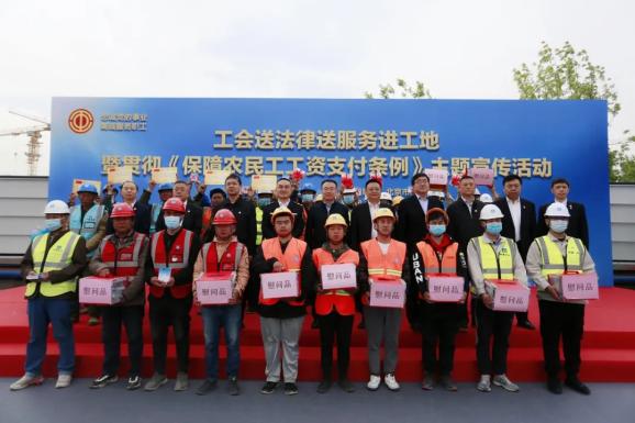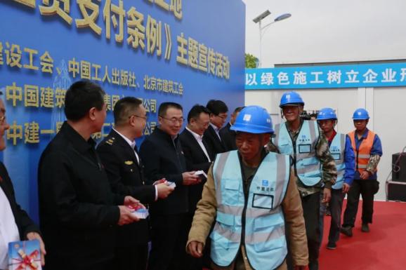 中建一局深入推进“我为群众办实事”实践活动,全面践行“暖职工、聚人心”要求,为职工群众把实事办好,把好事办实,推动党史学习教育进工地。4月29日,在《保障农民工工资支付条例》实施一周年之际,中国海员建设工会联合住房和城乡建设部人事司、人力资源和社会保障部劳动保障监察局、中国工人出版社、北京市建筑工会、中建集团,走进中建一局北京城市副中心160项目,开展工会送法律送服务进工地暨贯彻《保障农民工工资支付条例》主题宣传活动。中国海员建设工会分党组书记、工会主席李庆忠,分党组成员、工会副主席吴疆,住房和城乡建设部人事司二级巡视员路明,人力资源和社会保障部劳动保障监察局督查处处长李刚,中国工人出版社总编辑董宽,北京市建筑工会主席莫剑彬,中建集团党建工作部资深高级经理刘建波,中建一局党委书记、 董事长罗世威,党委副书记、工会主席郝建成等参加此次活动。