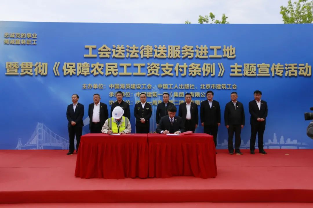 北京城市副中心160项目与专业法律机构签订法律援助协议,宣读“保障农民工工资支付及合法权益维护承诺书”。