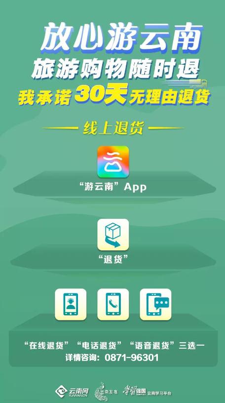 第一种方法是,下载“游云南”APP,点击“我要退货”,选择“在线退货”“电话退货”“语音退货”三种方式当中的任意一种来申请退货,其中电话退货拨打的号码是0871-96301;