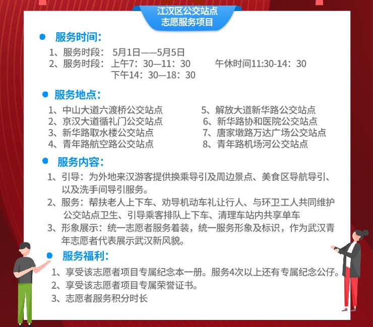 “五一小长假”的到来,作为英雄城市,即将迎来全国各地的游客,江汉区作为武汉的金融商贸中心、商圈聚焦,假期期间将引来大量的外地游客,为给他们提供更温馨的旅程体验,需要大量的志愿者在江汉区八大重要公交站点,进行多元化的志愿者服务, 进一步打造武汉服务窗口文明形象,展示武汉的文明形象。