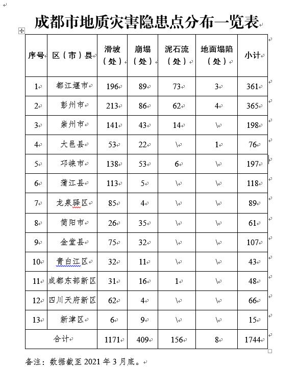 截至2021年3月底,成都共发现地质灾害隐患点1744处,其中滑坡1171处、崩塌409处、泥石流156处、地面塌陷8处,规模以小型为主,大、中型较少。地质灾害隐患点主要分布于西部龙门山区及东部龙泉山区的11个区(市)县和四川天府新区、成都东部新区。