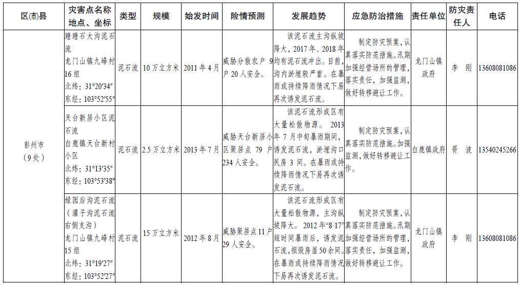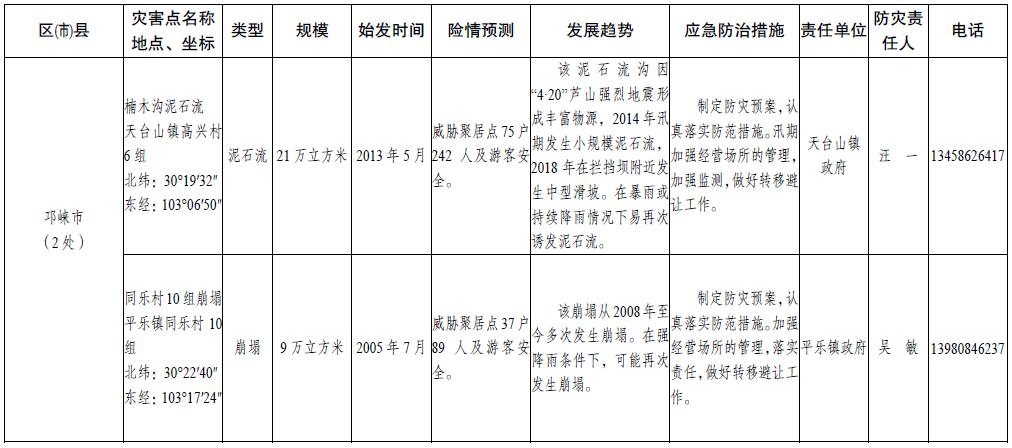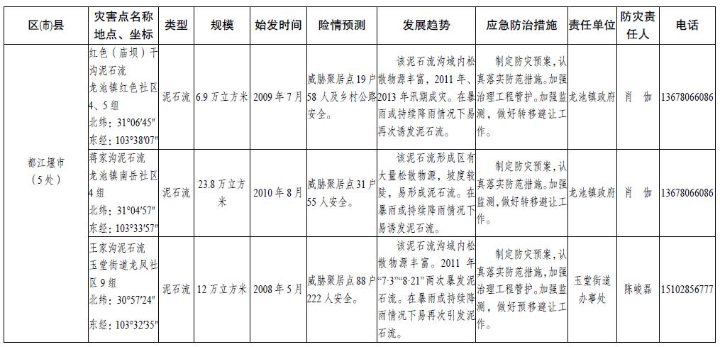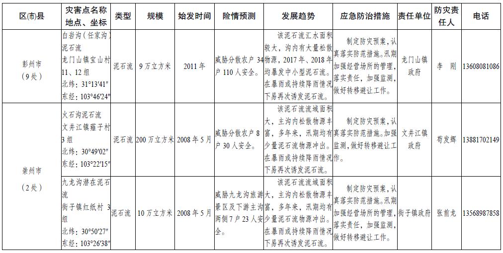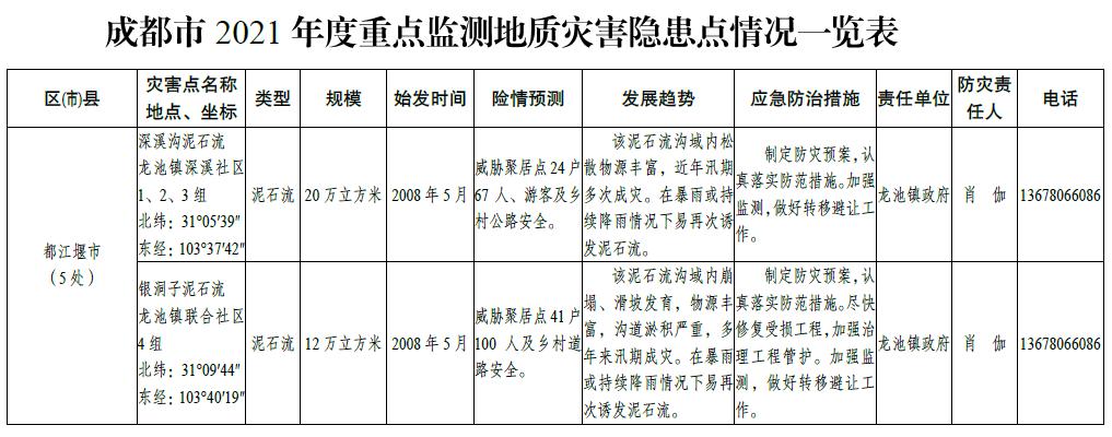 2021年,成都有关区(市)县要加强都江堰市白沙河、龙溪河,彭州市湔江、石匣子沟、白鹿河,崇州市文井江、九龙沟,大邑县出阝江河、雾山河,邛崃市火井河等流域内地质灾害危险区域的防范工作。