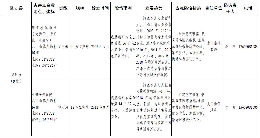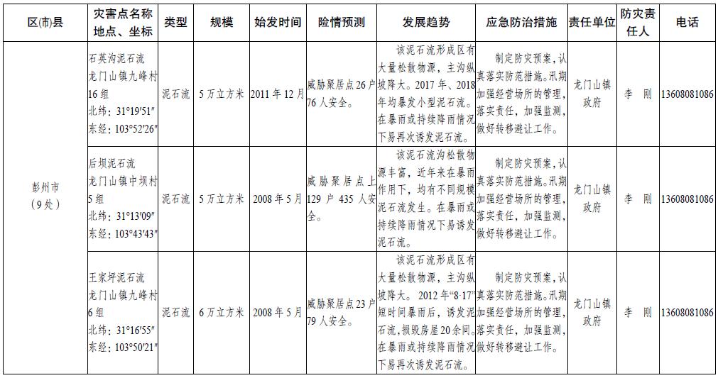 重点防范区域是西部龙门山区,涉及都江堰市、彭州市、大邑县、崇州市、邛崃市5个县(市)的40个镇(街道)。目前已查明地质灾害隐患点1197处。