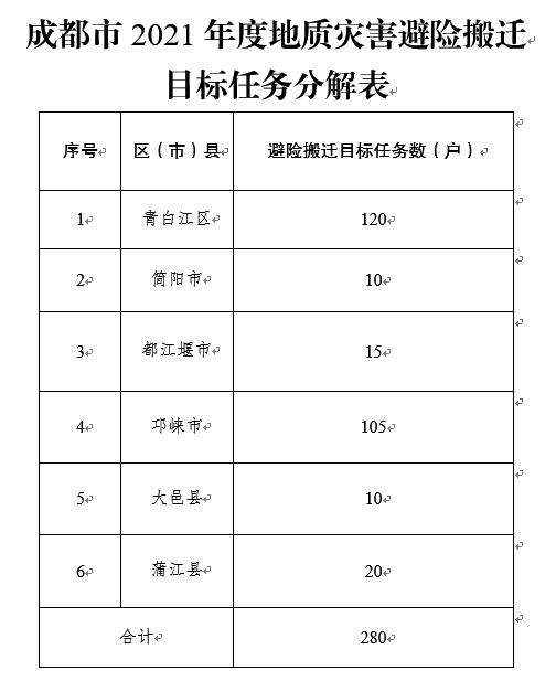 成都将实行奖励机制,鼓励整体搬迁和隐患点销号,确保在2021年11月底前完成2021年度全市280户避险搬迁任务目标。对威胁对象已经全部搬迁的危险区域,要保留地质灾害防治工作机制,继续巡查监管,杜绝受威胁对象返居、新建房屋等,防止出现新的隐患。