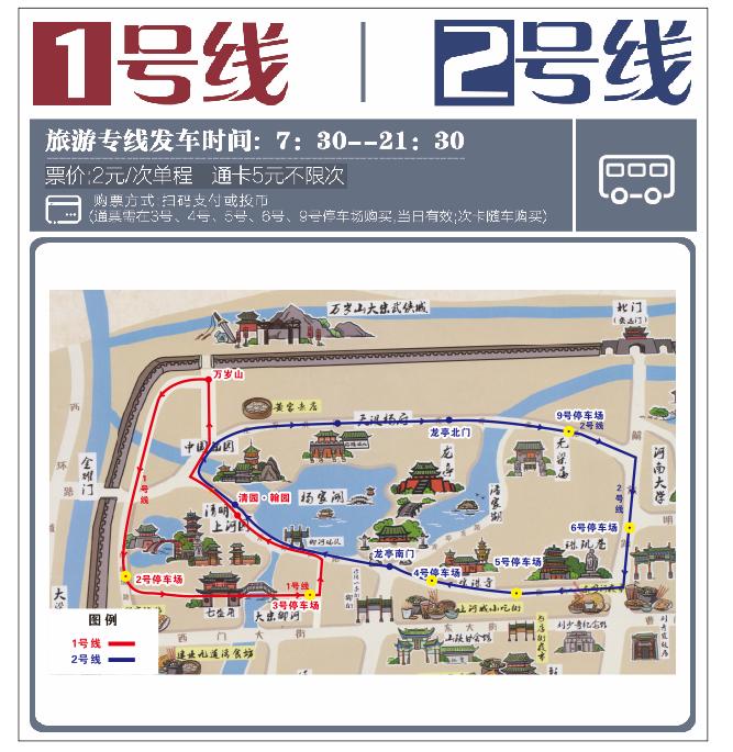 3号停车场——法院街——龙亭西路(法院街东口)——天坡桥——清明上河园迎宾门(翰园碑林南门)——1号停车场(龙亭西路与龙亭北路交叉口)——龙亭西路——万岁山南门城墙豁口——内顺城路向西——清明上河园端门——清明上河园金水门——内顺城路——2号停车场——法院街——3号停车场。