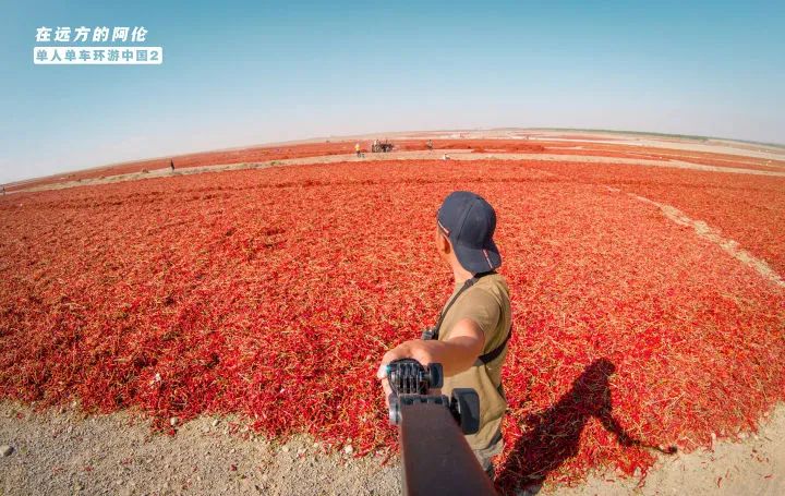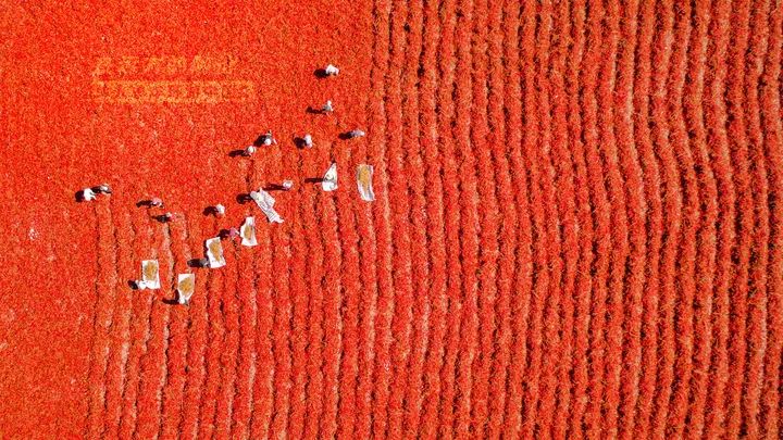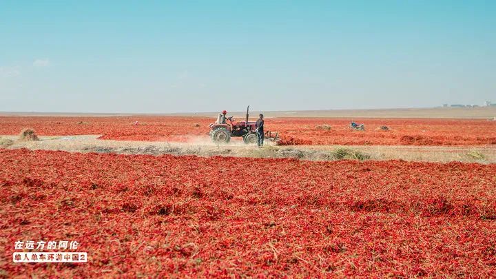 从每年的9月开始,安集海的辣椒就进入了采摘的季节,这里的辣椒种植户就会雇佣工人到农田采摘辣椒,然后用拖拉机运到这个晒场上晒干水分。这每一块儿红色的地毯,就代表着一家人的辣椒。