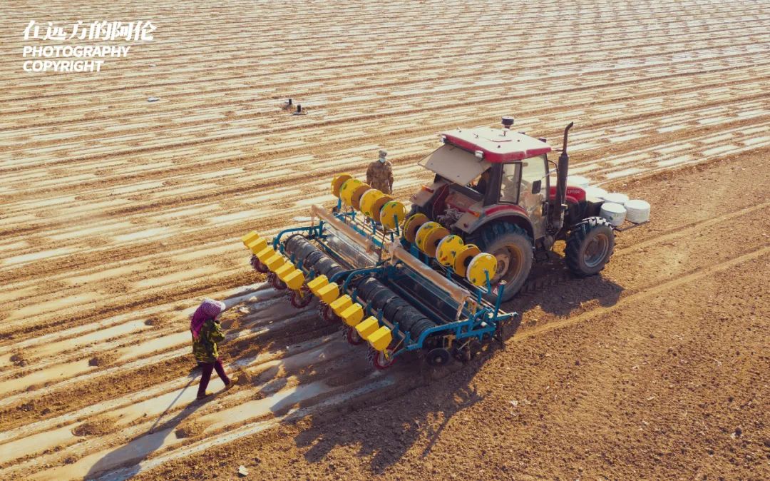 新疆是我国主要的棉产地之一,除了南疆的阿克苏、喀什之外,由连霍高速东西串起的昌吉州玛纳斯、呼图壁以及塔城的沙湾、乌苏,直到赛里木湖所在地的博州,都可以在G30连霍高速两侧看到规模巨大的棉田。我在昌吉偶遇这家普通农户时,正赶上他们2021年的第一天播种。通过北斗定位,播种、安放滴灌带、覆膜一次完成。