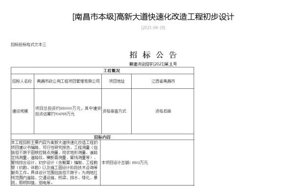 近日,江西省公共资源交易网发布了高新大道快速化改造工程初步设计招标公告,设计总额6502万元。