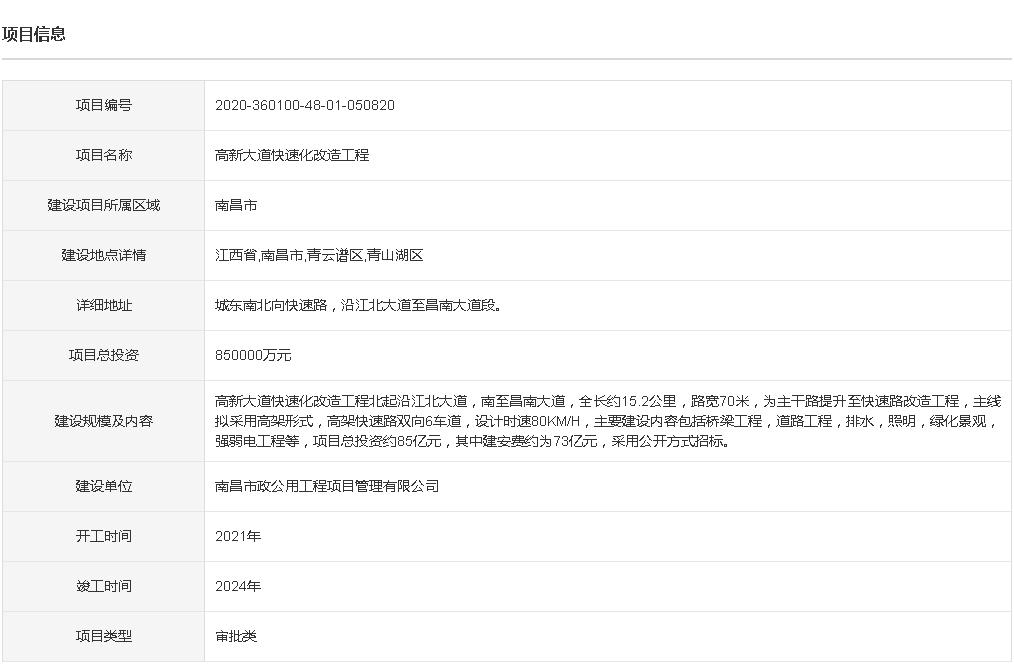 另外,江西省投资项目在线审批监管平台再次公示了高新大道快速化改造工程备案信息,此次备案,详细介绍了项目建设规模与内容。