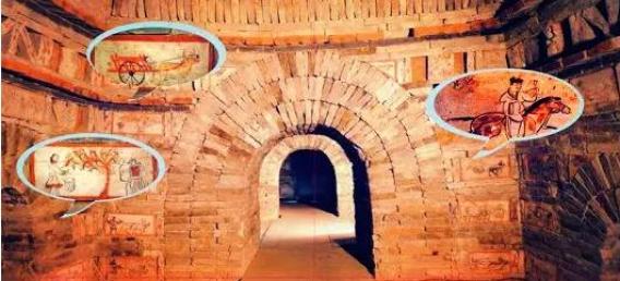 在嘉峪关,有生动再现驿使奔驰、出巡演练、驼队穿梭、商旅云集真实场面的“地下画廊”——魏晋墓群,中国邮政标志——驿使图,就出自这里。古墓群分布长达20多公里。1972年发掘清理了其中8座墓,6座墓中均有壁画,共有画面600余幅,绝大部分保存完好,有的色泽如新。
