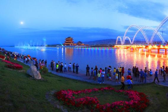 讨赖河生态环境治理工程由清华大学规划设计院总体规划,陕西省水利电力勘测设计研究院勘测设计。2010年7月开工建设,分四期实施,历时三年,2012年10月竣工。在南岸洪水槽上建设了明清风格夜光楼,建筑面积7500平方米。夜光楼南望祁连,背依雄关,登楼眺望,新市区美景尽收眼底。在新文大桥以东,夜光楼前,配套建设了大型音乐喷泉和水幕电影。建成橡胶坝主坝9座、副坝1座,跌水17级、泵站4座、亲水平台6处,治理河道8公里。通过清洪分治,蓄水造景,在确保防洪安全的基础上,将该段建成生态良好、环境优美、内涵丰富的一流生态文化景区。