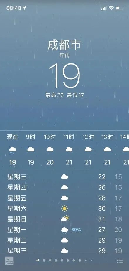 风雨过后,气温下降也较为明显,据@成都气象,预计今天白天阴天仍有阵雨,部分地方并伴有大风,最高气温跌至23℃。