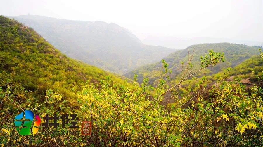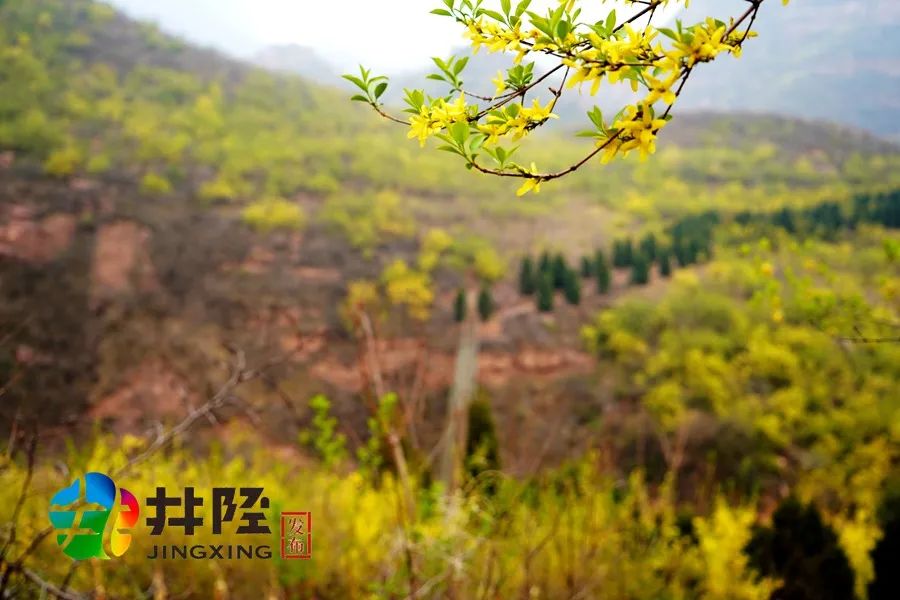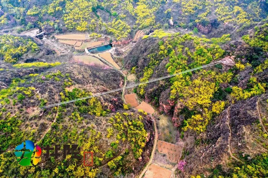 仲春时节,井陉县苍岩山镇洞阳坡生态经济园区内,万亩金灿灿的连翘花海铺满了重重山峰,与山峦、梯田、村落交相辉映,展现出一幅“画里乡村遍地金”的美丽画卷。