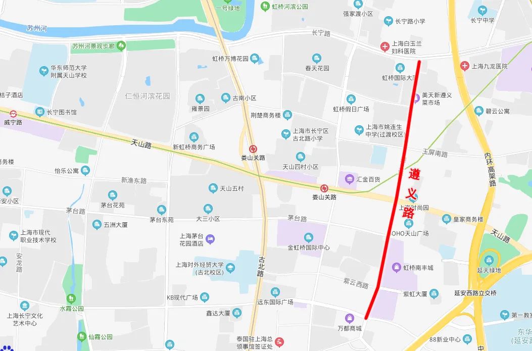 遵义路位于长宁区中部,南起仙霞路(接遵义南路),经紫云路、茅台路、玉屏南路,北至长宁路止,全长1353米。
