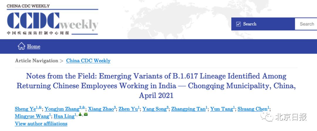 上述病例披露于论文《Emerging Variants of B.1.617 Lineage Identified Among Returning Chinese Employees Working in India — Chongqing Municipality, China, April 2021》,作者来自重庆市疾控中心、中国疾控中心等。