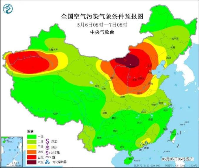 5月7日,沙尘影响减弱,中西部及东部偏南地区受局地扬沙或浮尘影响,空气质量将达到轻度污染。