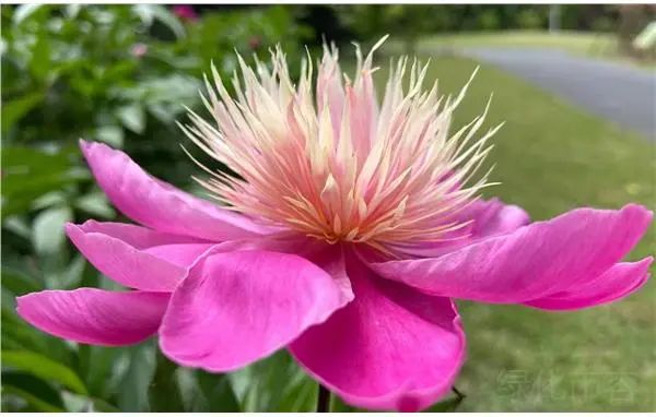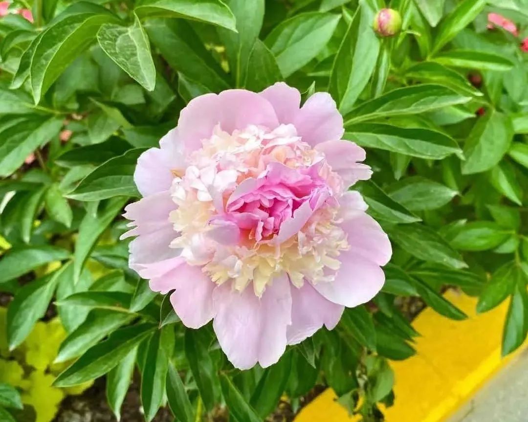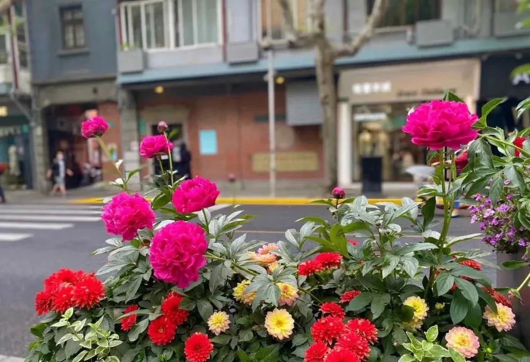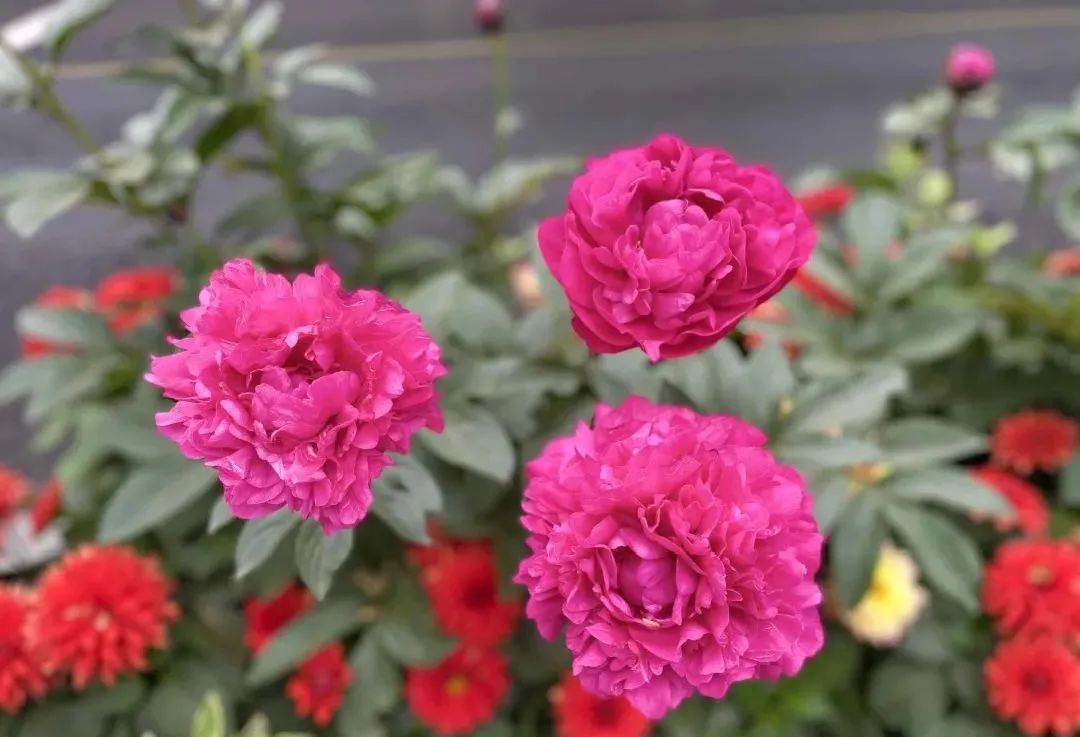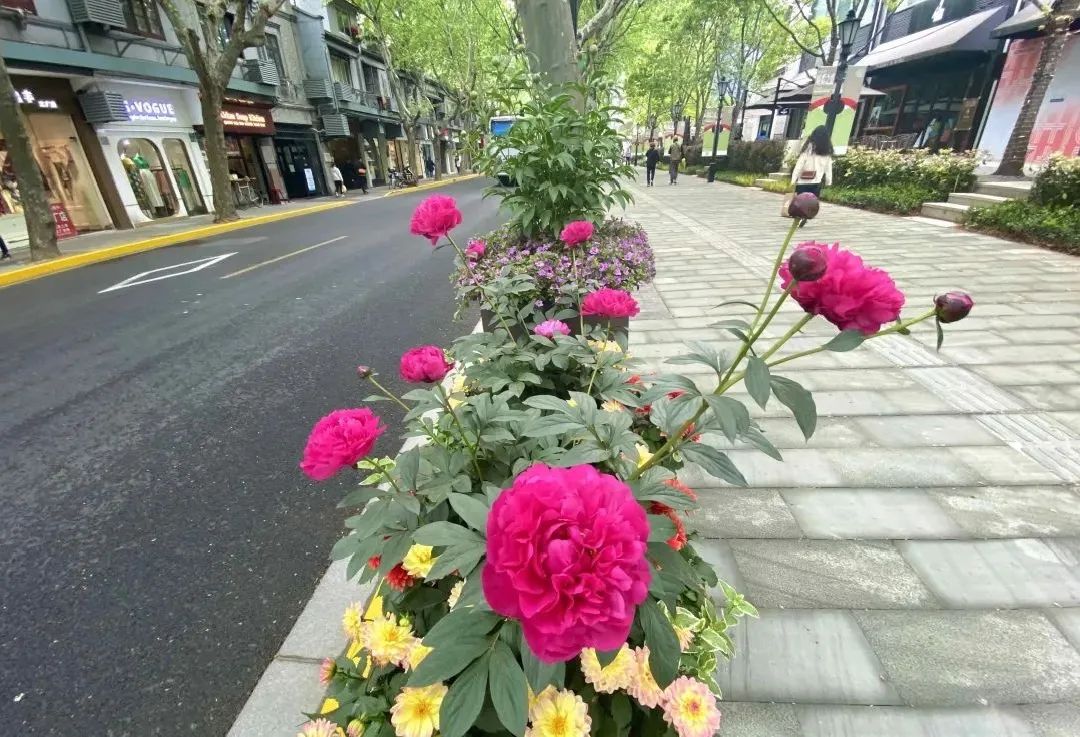 新天地区域的芍药,花开正旺,美不胜收。阳光下的芍药花,一朵朵绽放在马路两侧,虽然颜色各异,但都妩媚艳丽,美不胜收。