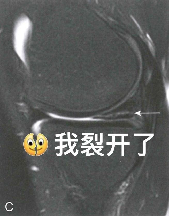 除了韧带可能在运动中被扯断、撞坏之外,膝关节里还有两块半月板也很容易受伤。就像坐在硬板凳上屁股硌得难受一样,膝关节上下两个大骨头要是直接硬碰硬,你的膝关节肯定不会好受。而半月板就像两块缓冲垫,能让股骨和胫骨和谐共处,你的膝关节也能正常发挥功能。不过,如果半月板出现了损伤,那你的膝关节可能就不会那么灵活,蹲下站起可能会“咔咔”响,甚至有时好像卡住了一样。这时,MRI也是诊断的重要工具,如果真的存在半月板撕裂,在膝关节MRI上就能看到半月板“裂开”了。