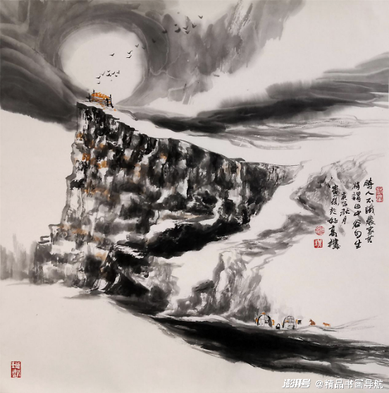 例如《千古苍塬育桑田》、《大地苍茫厚不言》、《大地苍茫处处娇》、《望断南飞雁》、《醉看风轻云淡时》、《今人不见古时月》、《千古一轮月,时序万世心》、《千秋一曲图》、《与君奏一曲请君,与我倾耳听》等作品,即使在标题上,就可见作者超越性的体验与表达。那是对人生的感悟,对历史的喟叹,对时空之神秘性的探望,对生命之意义的沉思默察,就正如其画中常常出现的那一轮明月,既映照出既往与今夜的孤独,又撩拨着明日的梦想,让人不由得想起张若虚的绝唱。作为回应,也许,我们的耳边会响起了一个声音,它学着张若虚诗句问道:“山中何人初见月,山月何时初照人?”