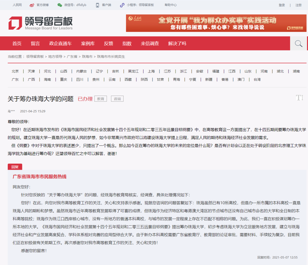 近日,有网友在人民网领导留言板上询问“正在筹办的珠海大学未来的定位是什么?”,5月7日,珠海市市民服务热线就该问题做出了答复: