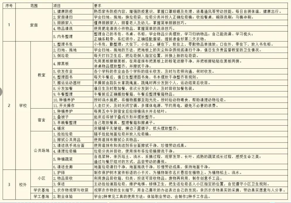 各中小学要进一步完善工作机制、强化激励保障,坚持典型引领和示范带动,形成德智体美劳全面培养、课程完善、资源丰富、模式多样、机制健全的劳动教育体系。