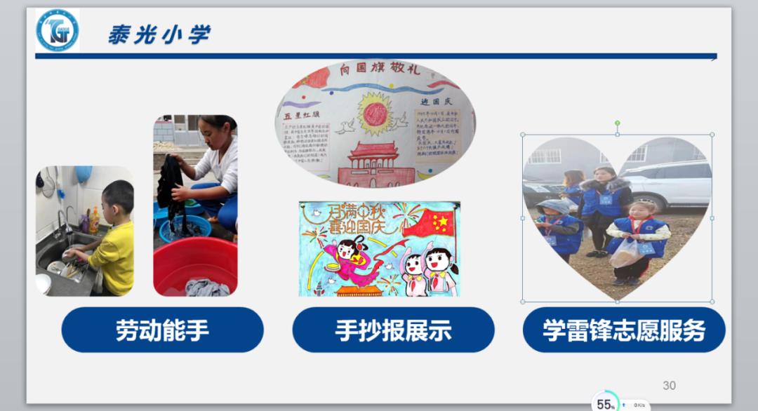 (四)大力推进社会劳动实践教育。联合社区、街道及各类公益场所,广泛开展志愿服务活动,充分发挥校团组织的作用,做好学生志愿服务的具体组织实施,教育引导学生在志愿服务中加强劳动,培育良好的社会公德。学校组建“泰小阳光志愿小分队”共有5支队伍,68名教师120名学生组成,组织动员相关力量、搭建活动平台,共同支持学生深入村庄社区、福利院和公共场所等参加志愿服务,开展公益劳动,参与社区治理。志愿队在紧张的学习之余,经常利用周末假期时间,去看望村庄的爷爷奶奶们,给他们带点爱吃的水果和点心、陪他们聊天、为他们梳头、帮他们打扫卫生等,让老人们感受到社会的温暖和亲人般的体贴。另外,学校每年寒假都会组织“清洁家园献爱心”亲子活动,通过清理村庄垃圾死角、小广告、帮助老人清洁个人卫生、整理衣物、剪指甲、表演节目等活动,培养学生的劳动能力、责任意识和感恩意识。