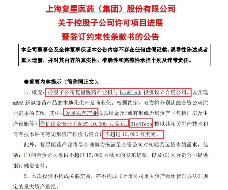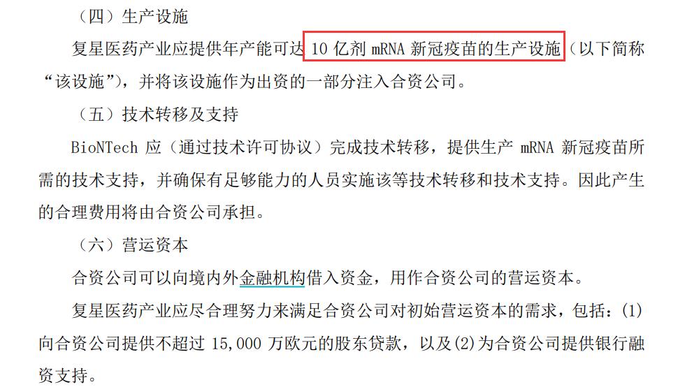 为进一步落实《许可协议修正案一》中有关 mRNA 新冠疫苗本地化生产的安排,双方今日宣布签订《条款书》,成立合资公司,并约定复星医药产业应提供年产能可达 10 亿剂 mRNA 新冠疫苗的生产设施,并将该设施作为出资的一部分注入合资公司。