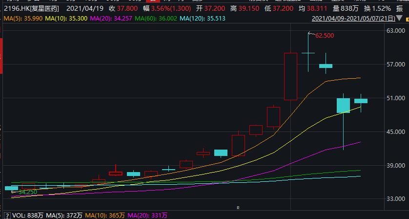 5月4日,复星医药盘中一度涨近6%报62.5港元,股价再创历史新高价,市值达1800亿港元。较4月7日32.95港元盘中低点相比,仅一个月的时间,该股累计涨幅接近90%。