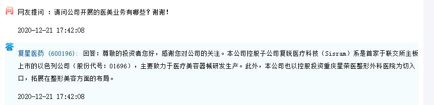 而复星医药早已布局了医美领域。2013年,复星医药成立复锐医疗科技,主要从事医疗美容器械研发生产。同年,复锐医疗就完成了对以色列医美器械商Alma Lasers的收购。此外,复锐医疗还收购医美分销公司、成立整形医院等。
